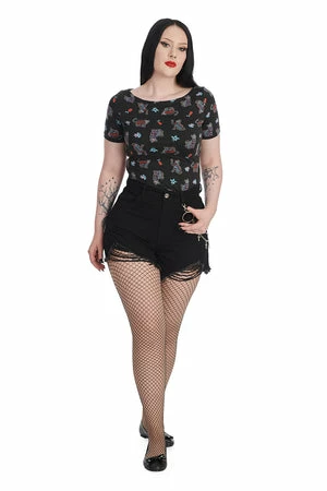 The dark top has skeleton cat design, a round neckline, short sleeves and a figure accentuating fit.