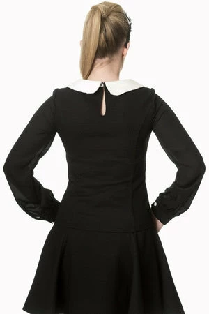 An awesome, gothic, ladies long sleeve top design by Banned, the “till dawn collar blouse”, in black with a white collar and button details.
