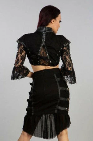 This Ines steampunk black twill and black matte vinyl bolero shrug has black lace three quarter sleeves, black matt buckles, silver studs details and a flattering fit.