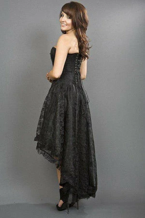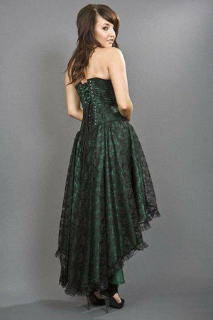 This Mollflanders victorian goth corset dress has black lace overlay, laced ribbon detail, side zip fastening and back lace fastening with modesty panel.