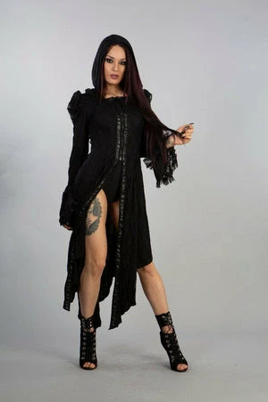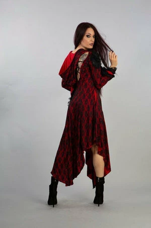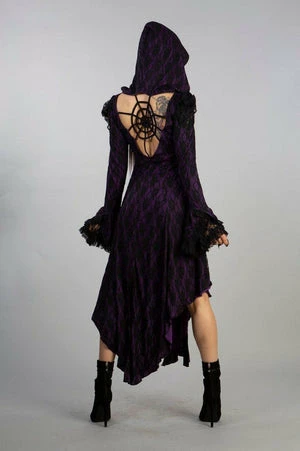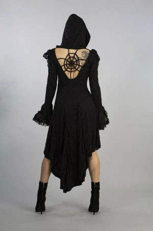 This Pentagram cotton and black lace overlay, maxi dress has a long hood, cut-out detail, flared sleeves, front slinky split, a flattering fit and it fastens with zipper at the front.