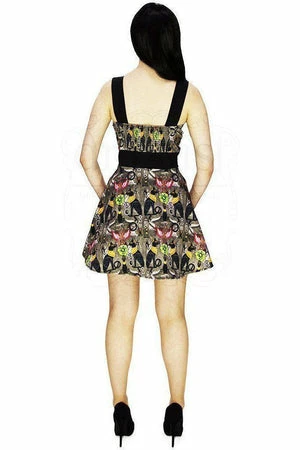 The sleeveless stretchy mini dress has an Egyptian print, a sweetheart neckline, halterneck tie, front faux buttons, black waist line and a figure accentuating shape.