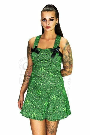 The sleeveless stretchy green dress has Marijuana leaves print, halterneck tie and a figure accentuating shape.