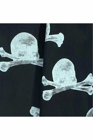 The sleeveless non-stretch, black cotton mini dress has grey skulls and bones print, halterneck tie, a round neckline, red piping detail and a figure accentuating shape.