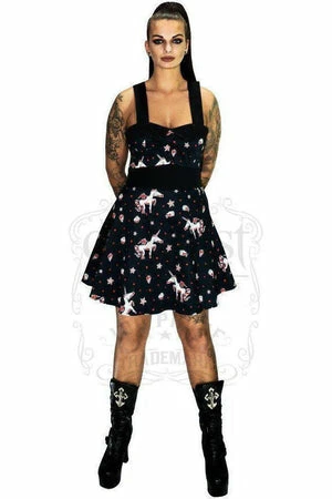 The sleeveless stretchy sheer mini dress has cream dipped strawberry, skull cupcake, poison bottles, stars and unicorns print, a sweetheart neckline, halterneck tie, f