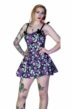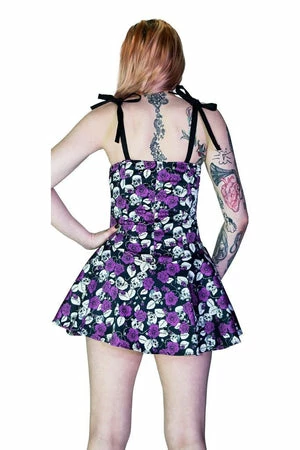 The sleeveless stretchy dress has purple roses and skulls print, tied straps and a figure accentuating shape.