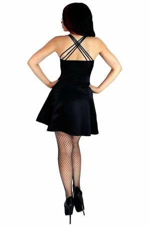 The sleeveless non-stretch, black silk mini dress has faux silver buttons, triple elastic straps, a sweetheart neckline and a figure accentuating shape.