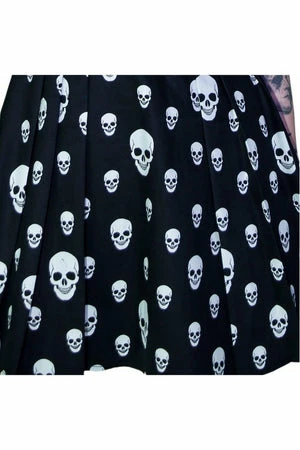 The sleeveless stretchy, black mini dress has ivory skulls print, tied straps and a figure accentuating shape.