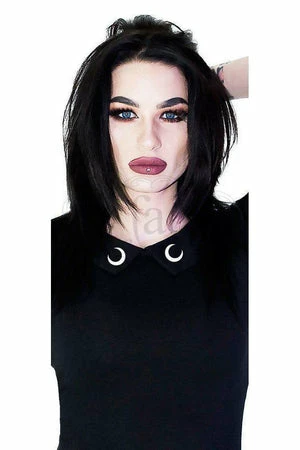 The jersey mix, long dress has crescent moon print, black collar and a figure accentuating shape.