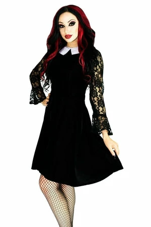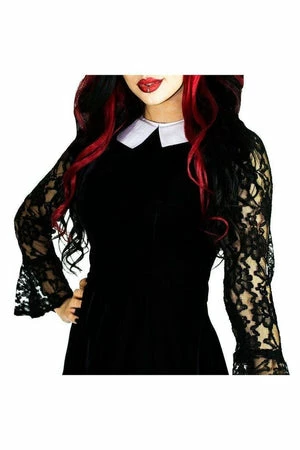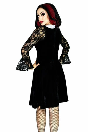 The soft luxe black mini velvet dress has white collar, long lace sleeves, a figure accentuating shape and it fastens with a hidden zipper.