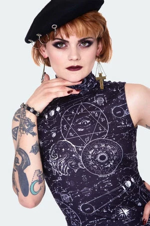 The midi high slit dress has eye pentagram, supersticious cat and symbolic zodic signs design, high neckline, side slit detail and a flattering fit.
