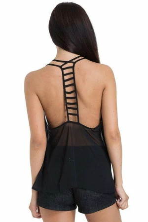 This sheer chiffon black vest has a V-neckline, ladder detail on straps and a flattering fit.