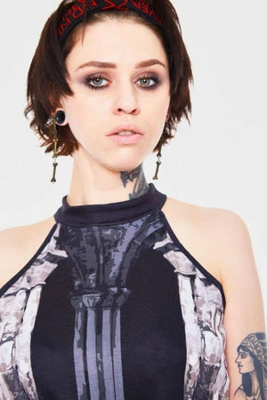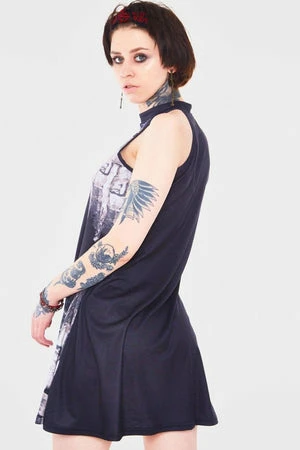 This style is crash hot! a black, halterneck sleeveless swing dress style from Jawbreaker, with a Gothic church column print on the front.
