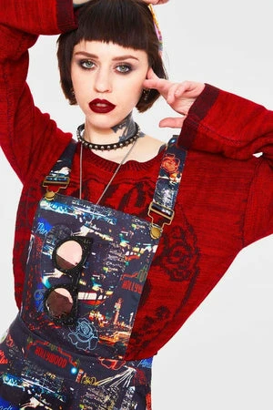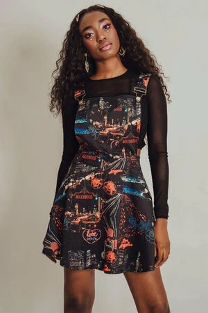 The dungaree style mini dress has city lights print, a square neckline, a figure accentuating shape, back cross detail, adjustable straps and it fastens with a zipper at the center back.