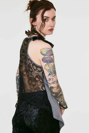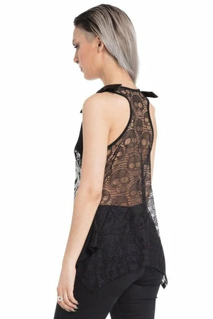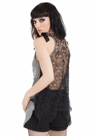 This gothic tanktop is off the heezie, available in grey or black, this design called Deathclock features a clock surrounded by skulls and bat wings, the design features a round neckline, bows on the shoulders and a skulls embroidery at the back.
