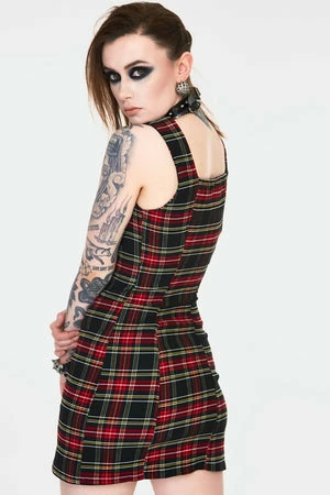 The bodycon mini dress has all over colorful tartan print, a round neckline, hook & eye details and a figure accentuating shape.
