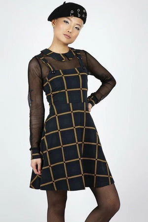 The pinafore style mini dress has grey plaid print, a square neckline, full length mesh sleeves, button and star-ring detailing and a flattering fit.