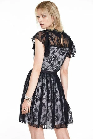 The lace overlay dress has floral design, neck tie detailing, collar neckline, capped sleeves and it fastens at the front with a button.