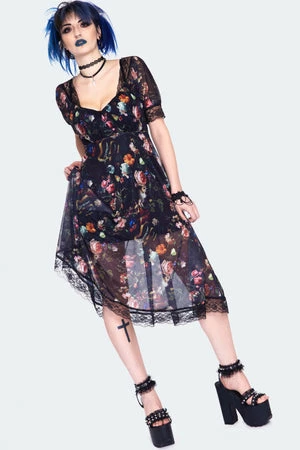The mini dress has night garden themed design, mesh and lace trim detailing, short sleeves and a flattering fit.