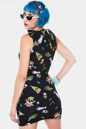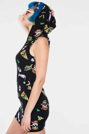 This skulls and fast food bodycon dress by Jawbreaker, has an allover gothic print of fast food, including milkshakes, pizzas, fries and skullburgers! This design is made in black, 95% cotton and 5% elastane, so it is stretchable and hugs the figure tightly, it has a v neckline and a hood at the back.