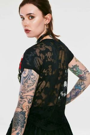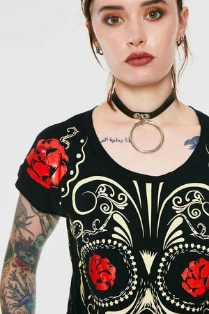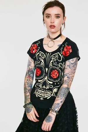 A superfly day of the dead style, sugar skull, black short sleeve t-shirt design from Jawbreaker, this tempting design is further embellished with a skull and crossbones mesh at the back.
