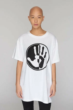 An imposing, white unisex t-shirt from Long Clothing. This t-shirt has a fierce black and white hand print at the front.