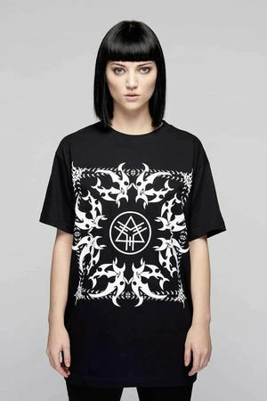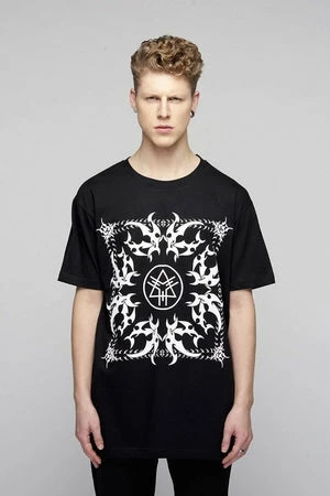 Check out this spiffylicious, unisex short sleeve t-shirt design from Long Clothing. This style, called Core, is available in black with a choice of white or red print, and has a wicked print of tribal weapons surrounded with a frame of bones.