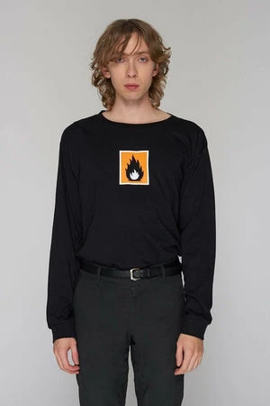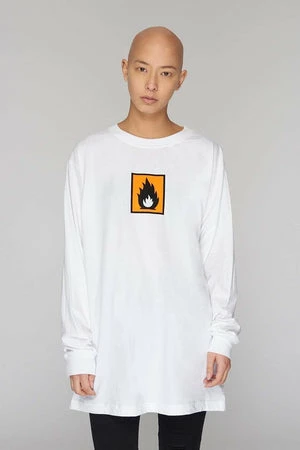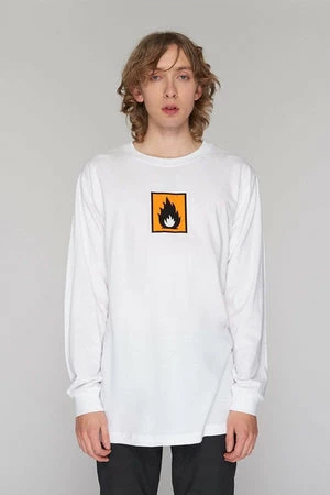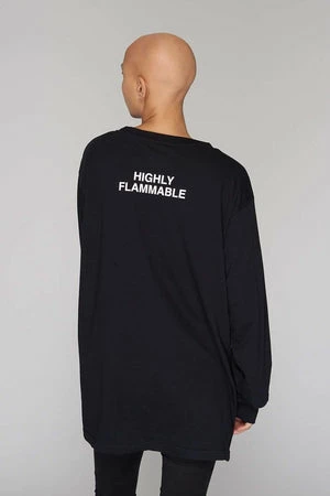 Cause hell burnin’ fire in this unisex long sleeve t-shirt by Long Clothing, available in white and black and featurnig a front blazing flammable print and back “HIGHLY FLAMMABLE” caption.
