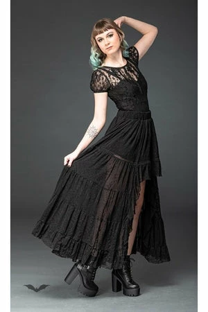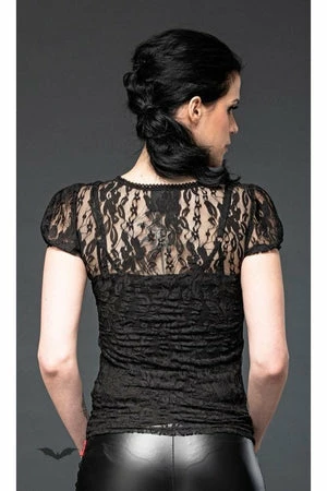 This simple but elegant gothic styled top has a lace look to it. Short, slightly puffy sleeves give this awesome top a bit of character, with the lace itself covered in black flowers.