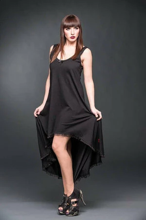 The black asymmetrical dress has a cross and lacing details on the collar and skirt, round neckline and a lacing design on the back.