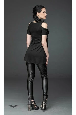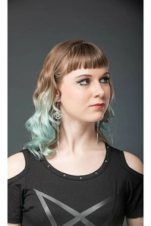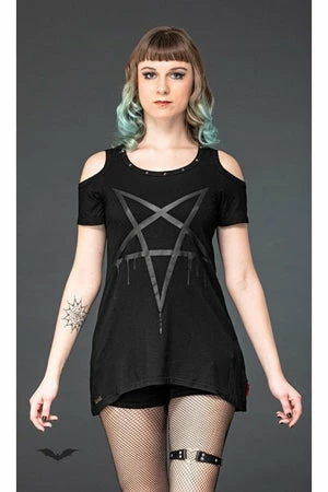 Anyone who loves pentagrams and shoulderless tops will love this top from Queen of Darkness. This top has an awesome dripping pentagram design on the front with short cold shoulder sleeves.