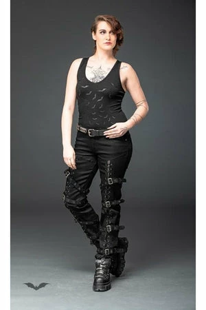 A wicked design for any vampire, this sleeveless top is created by Queen of Darkness. On the front is a print of many flying bats, and the back of the top is open cut.